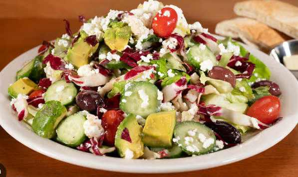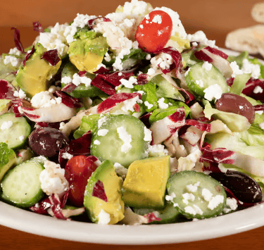Fresh greens with tomato, cucumber, olives, pepperoncini peppers, feta cheese, dressing - Greek dressing